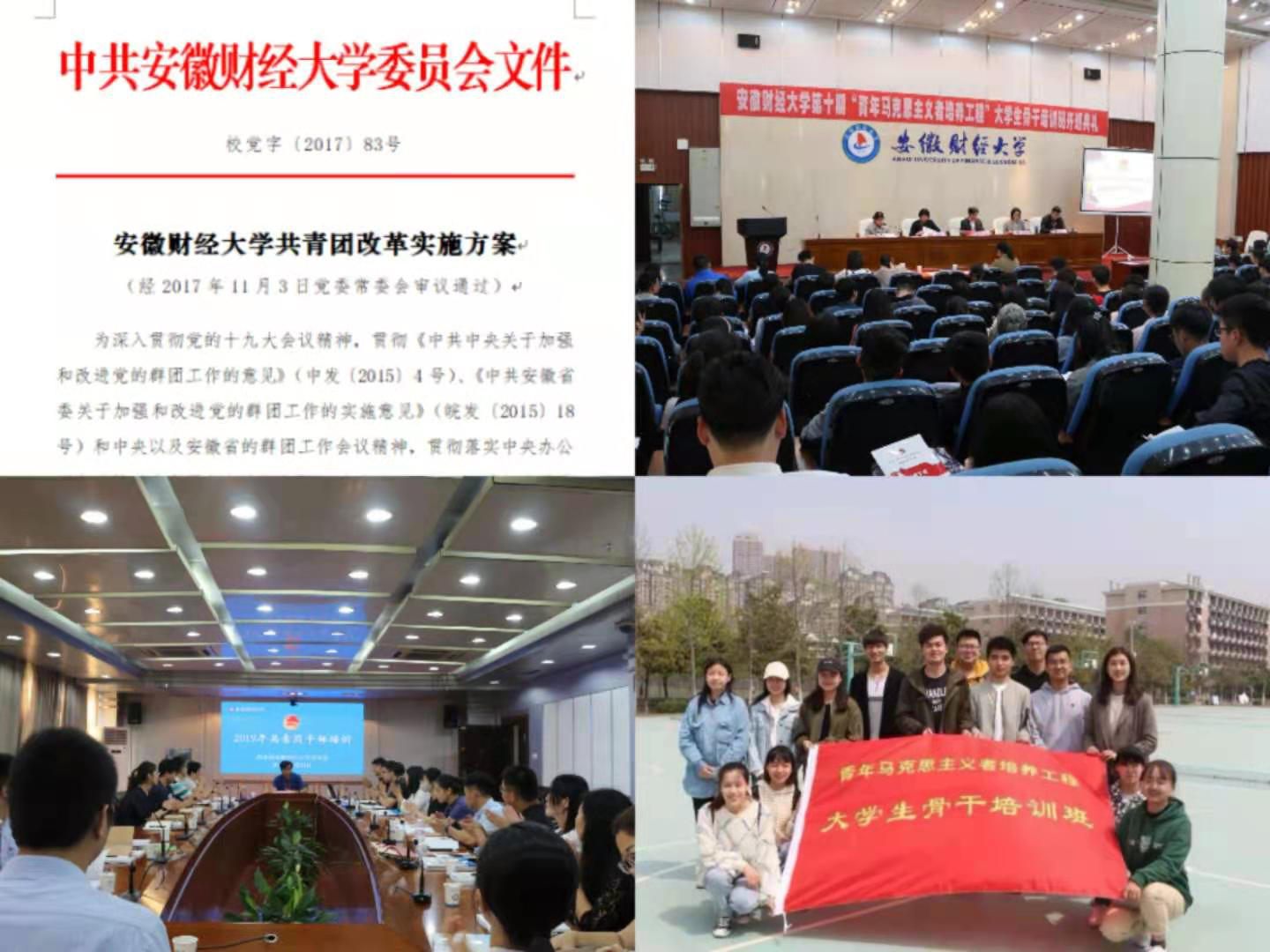持续深化共青团改革。出台《安徽财经大学共青团改革实施方案》,修订出台《安徽财经大学学生会章程》《安徽财经大学社会实践活动管理办法》《安徽财经大学“第二课堂成绩单”制度实施办法》等配套制度20余项,有效保障了各项改革举措的落实落细。截至目前,已经实现了二级学院团代会全覆盖,学生会改革的各项改革举措也已完成并顺利通过团省委检查验收。强化基层团组织建设。制定《关于在全校开展“团支部建设年”活动的实施方案》,通过严格执行“三会两制一课”“班团一体化”“对标定级”等制度,创新方式方法,完善机制,不断提升团支部的规范化水平,激发基层团组织活力。学校连续两年“学社衔接”“团组织整顿”等关键指标完成率均实现100%,位列全省第一。校学生团体联合会团支部和工商管理学院小红帽团支部先后被评为全国高校“活力团支部”。持续加强团的队伍建设。通过举办团校培养活动、学生干部培训班等,推进“青年马克思主义者培养工程”。突出分层分类、以点带面培养学生骨干,累计培养各类学生骨干10143人;连续3年与国家教育行政学院合作开设团学工作专题网络培训班,不断提升团干部政治素质和业务水平;组织开展共青团理论研究工作,2020年申报立项安徽省学校共青团研究课题7项;实现了团干部的专兼挂由校级层面向院级层面的延伸。