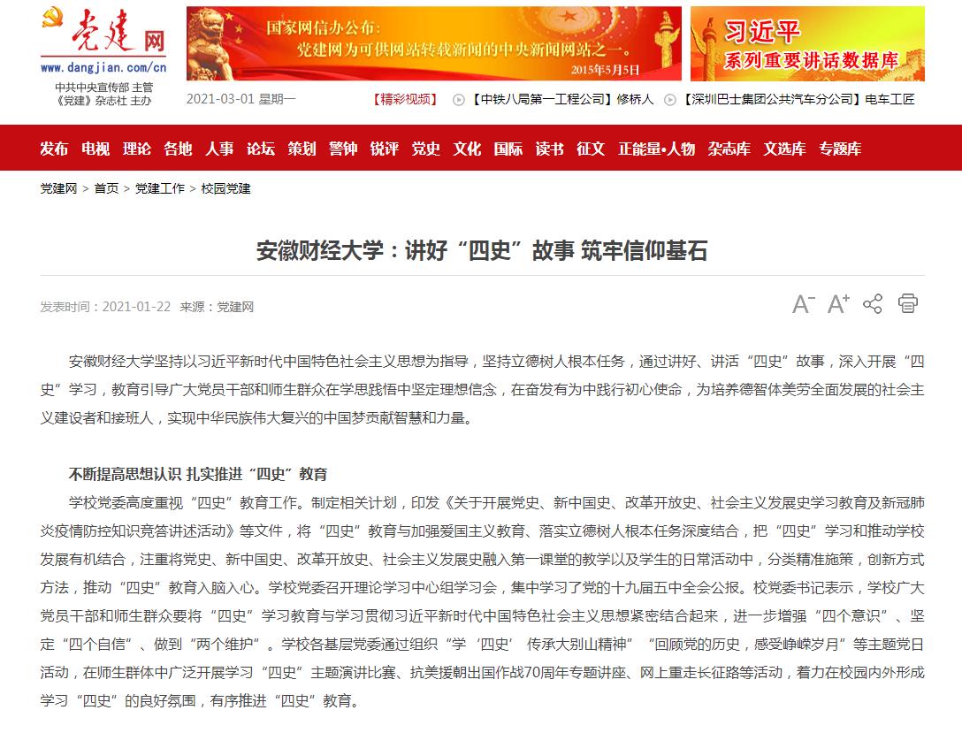 1月22日,党建网以《安徽财经大学:讲好“四史”故事 筑牢信仰基石》为题,报道了我校深入开展“四史”教育。