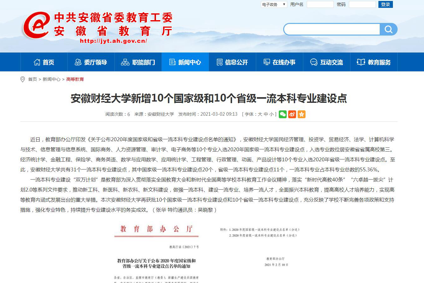 3月2日,安徽教育网报道我校新增10个国家级和10个省级一流本科专业建设点