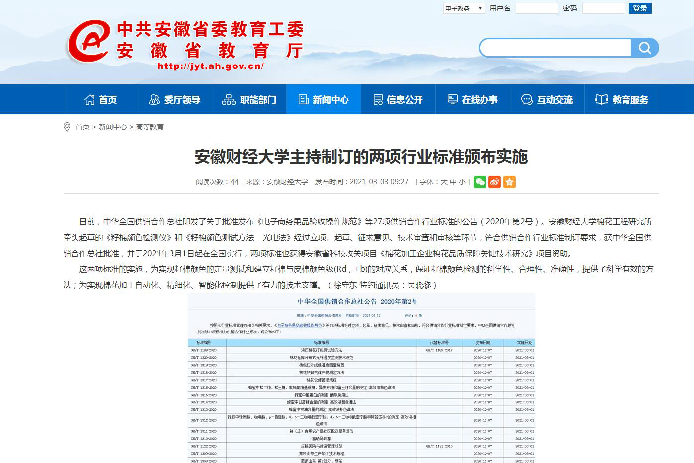 3月3日,安徽教育网以“安徽财经大学主持制订的两项行业标准颁布实施”为题报道我校棉花工程研究所主持制订的两项行业标准颁布实施。