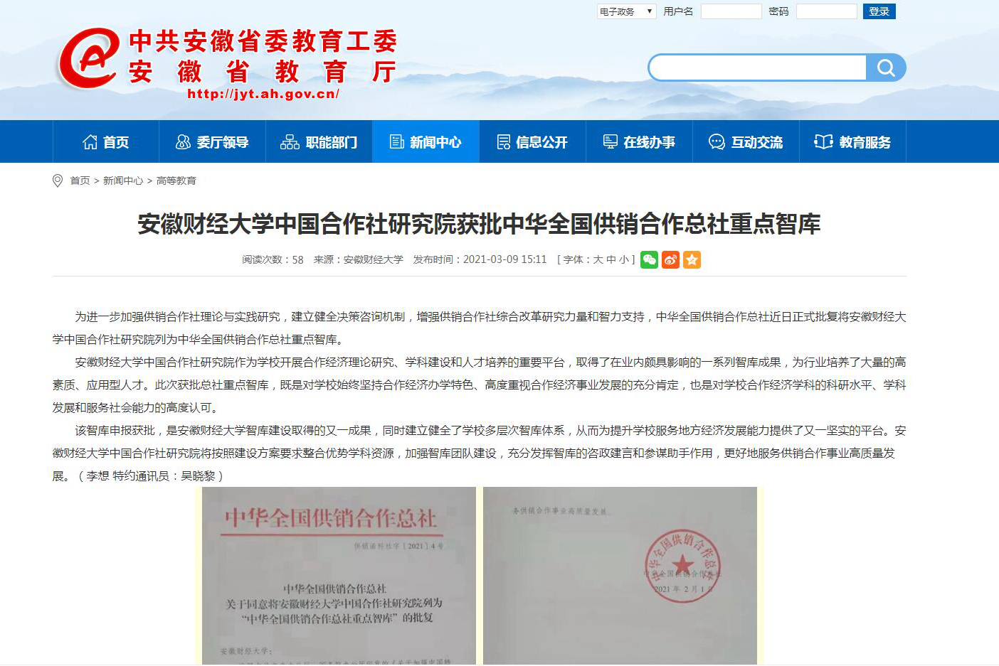 3月9日,安徽教育网以“安徽财经大学中国合作社研究院获批中华全国供销合作总社重点智库”为题报道我校智库建设工作。