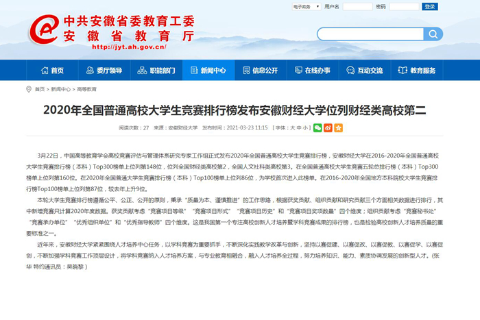 3月23日,安徽教育网以“2020年全国普通高校大学生竞赛排行榜发布 安徽财经大学位列财经类高校第二”为题报道我校学科竞赛排行情况。