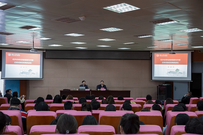 3月22日下午,我校“大千讲堂”第十六讲在龙湖东校区博文楼研究生报告厅举行。南京大学商学院副院长,国际经济贸易系教授,博士生导师,教育部高等学校经济与贸易类专业教指委成员,全国国际商务专业学位研究生教育指导委员会成员,中国世界经济学会常务理事于津平作题为“经济全球化的新格局与中国自贸试验区的角色定位”专题报告。校党委常委、副校长冯德连教授主持报告会。国际经济贸易学院全体师生共同聆听了报告。