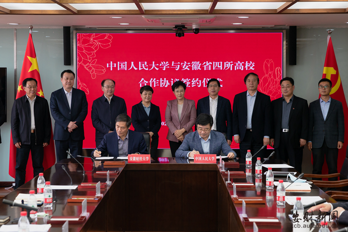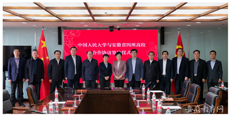 3月22日下午,安徽大学、安徽师范大学、安徽农业大学、安徽财经大学等4所省属高校和中国人民大学签约仪式在中国人民大学举行。副省长王翠凤,省委教育工委书记钱桂仑,中国人民大学党委书记靳诺、校长刘伟,安徽大学、安徽师范大学、安徽农业大学、安徽财经大学与中国人民大学负责同志出席签约仪式。