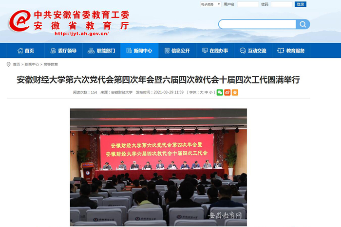 3月29日,安徽教育网、凤凰网、安徽新闻网报道我校第六次党代会第四次年会暨六届四次教代会十届四次工代圆满举行。