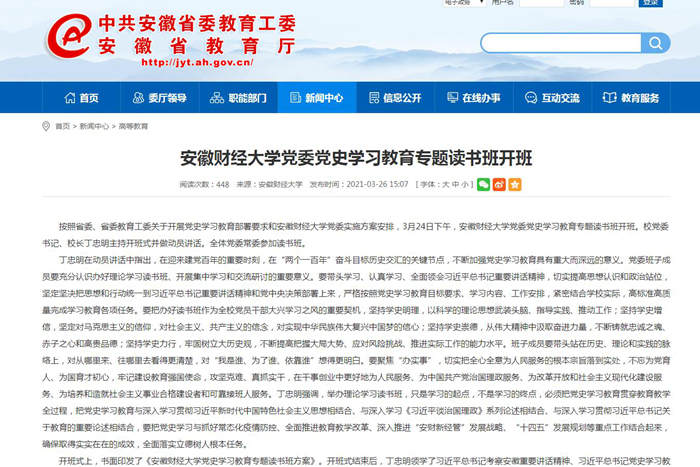 日,安徽教育网报道我校党委党史学习教育专题读书班开班。
