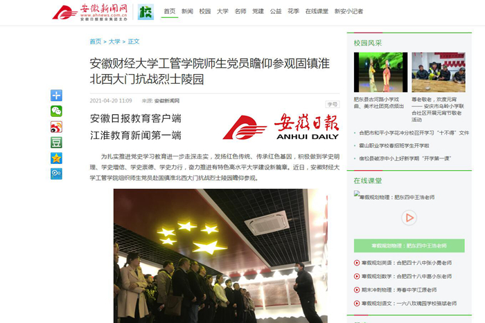 4月20日,安徽新闻网报道我校工管学院师生党员瞻仰参观固镇淮北西大门抗战烈士陵园