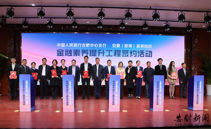 中国人民银行合肥中心支行与我校在内的蚌埠四家高校负责人进行了签约。与会领导共同为“金融素养提升工程”金融讲师团成员代表颁发聘书。