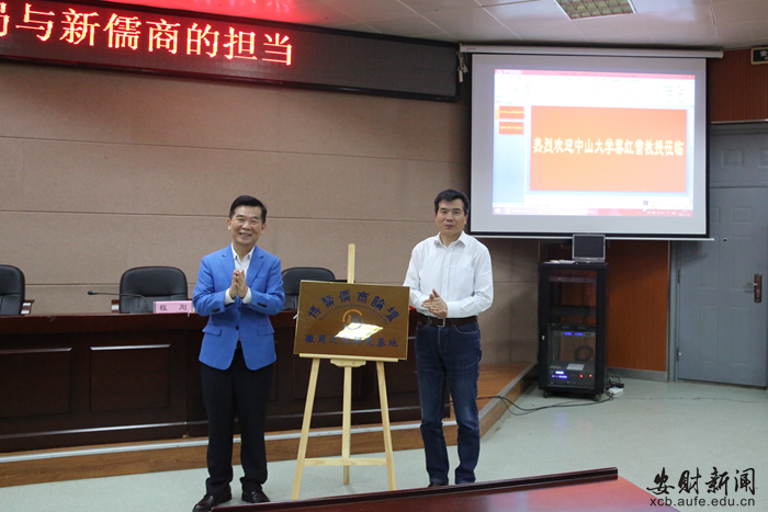 5月16日,“博鳌儒商论坛徽商文化研究基地”挂牌仪式在龙湖东校区研究生报告厅举行。博鳌儒商论坛理事长、中山大学黎红雷教授,安徽财经大学副校长程刚教授共同揭牌,文学院院长方军主持挂牌仪式,200多名师生和本地企业家代表参加。