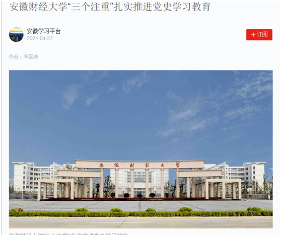 4月23日,学习强国、凤凰网、安徽新闻网以《安徽财经大学“三个注重”扎实推进党史学习教育》为题,报道了我校“三个注重”扎实推进党史学习教育。