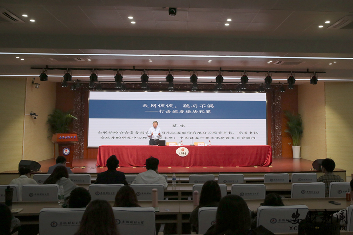 蔡咏简述了证劵犯罪的概念以及当前证劵期货犯罪案件呈现的五大特点,结合我国《刑法》《证劵法》,选取欣泰股份、中恒通公司、唐汉博等人为操纵证券市场案、华夏基金内幕交易案、工银瑞信内幕交易案和海欣食品虚假信息案等六大典型案例,对证劵违法犯罪进行详细分析,让师生直观了解证劵违法犯罪对我国证券市场的负面影响。蔡咏总结了当前证劵犯罪打击不力的原因,提出了建立证券集体诉讼制度和证券民事赔偿机制的解决路径。在互动环节,蔡咏就师生关注的证券领域相关问题进行了详细解答。