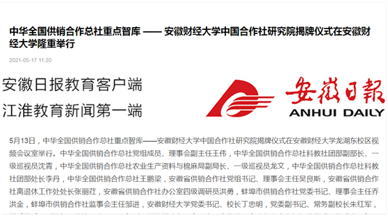 5月17日,凤凰网、安徽新闻网、安徽教育网以“中华全国供销合作总社重点智库安徽财经大学中国合作社研究院揭牌仪式在安徽财经大学隆重举行”为题,报道了我校的中国合作社研究院揭牌仪式。