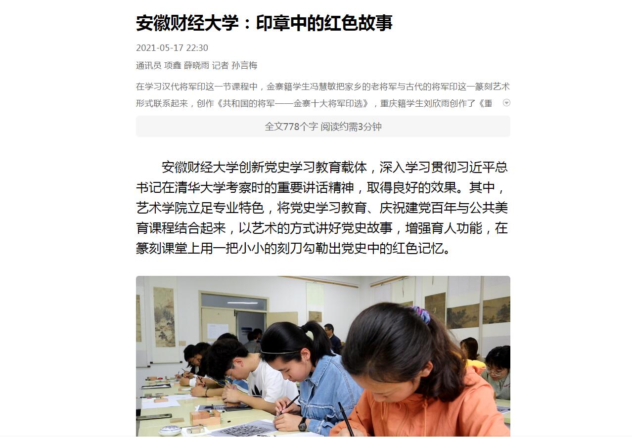 5月17日,5月20日,安徽日报,学习强国,安徽教育网网以“安徽财经大学:印章中的红色故事”为题,报道了我校以专业课程为依托开辟党史学习教育新课堂。