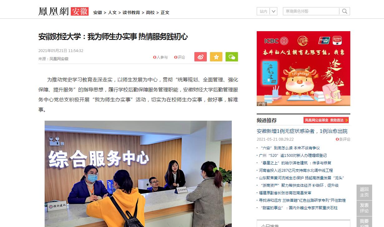 5月21日,凤凰网、安徽新闻网以“安徽财经大学:我为师生办实事 热情服务践初心”报道我校我为群众办实事系列举措。