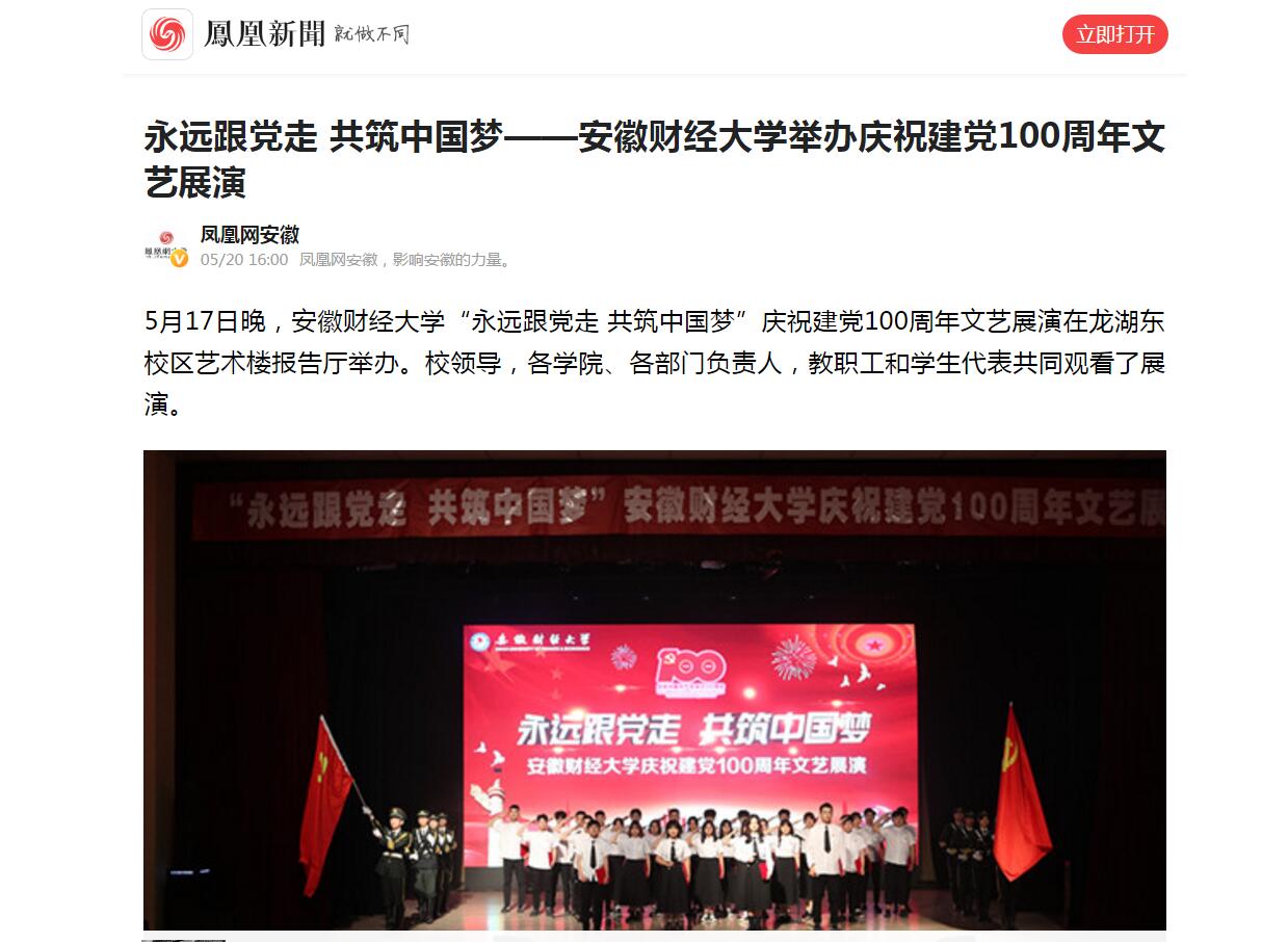 5月20日,凤凰网、安徽新闻网报道我校举办庆祝建党100周年文艺展演