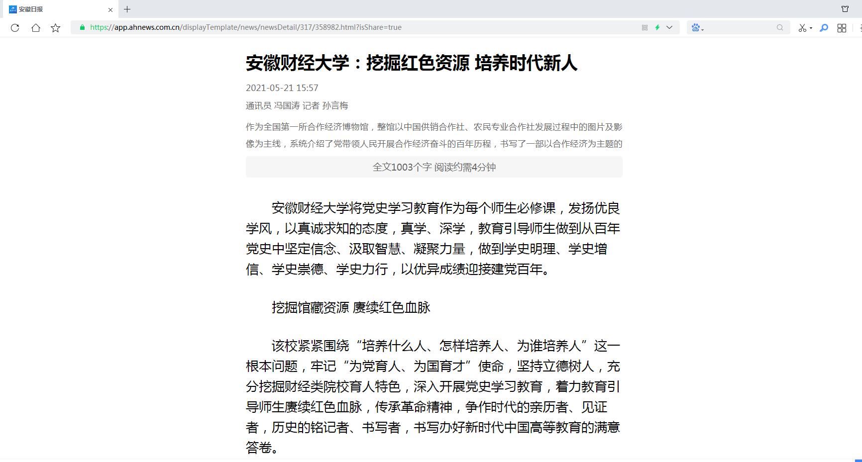 5月21日,安徽日报报道我校将党史学习教育作为每个师生必修课,发扬优良学风,以真诚求知的态度,真学、深学,教育引导师生做到从百年党史中坚定信念、汲取智慧、凝聚力量,做到学史明理、学史增信、学史崇德、学史力行,以优异成绩迎接建党百年。