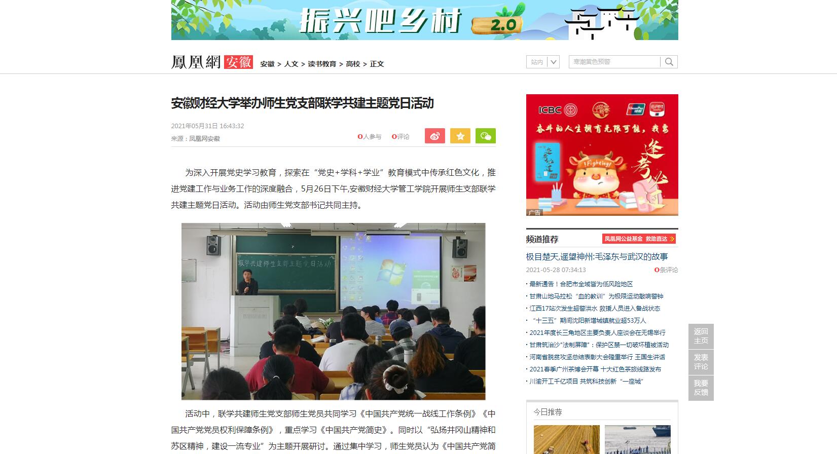 5月31日,凤凰网、安徽新闻网以《安徽财经大学举办师生党支部联学共建主题党日活动》为题报道我校师生党支部共同举办主题党日活动。