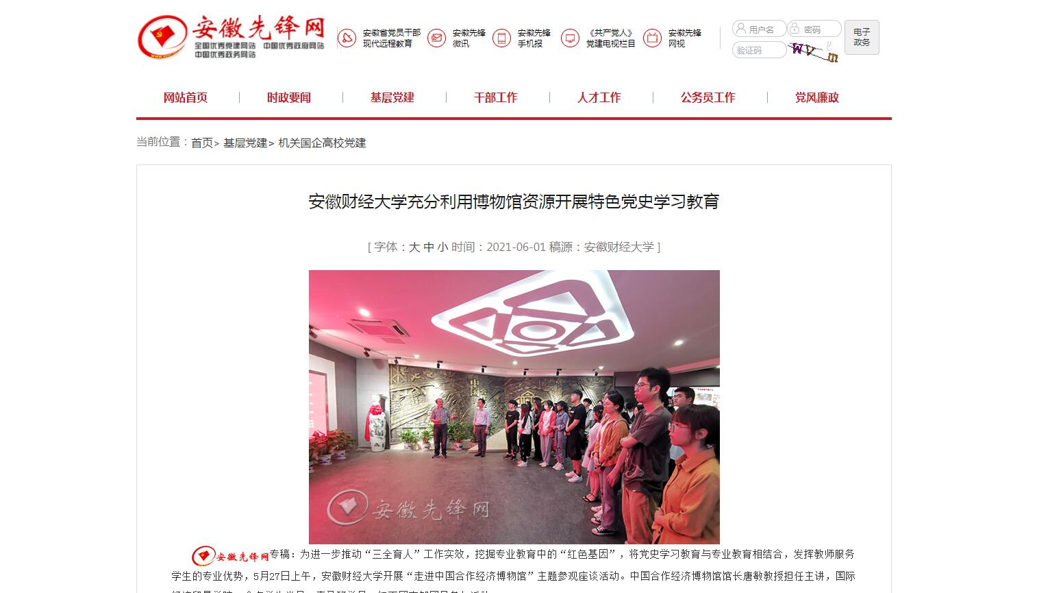 6月1日,安徽先锋网以《安徽财经大学充分利用博物馆资源开展特色党史学习教育》为题报道我校开展党史学习教育特色活动。