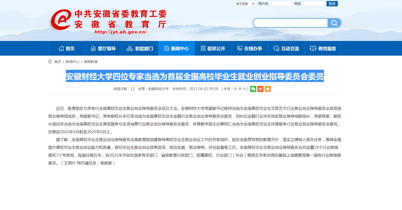 6月1日,安徽教育网报道我校四位专家当选全国高校毕业生就业创业指导委员会委员。