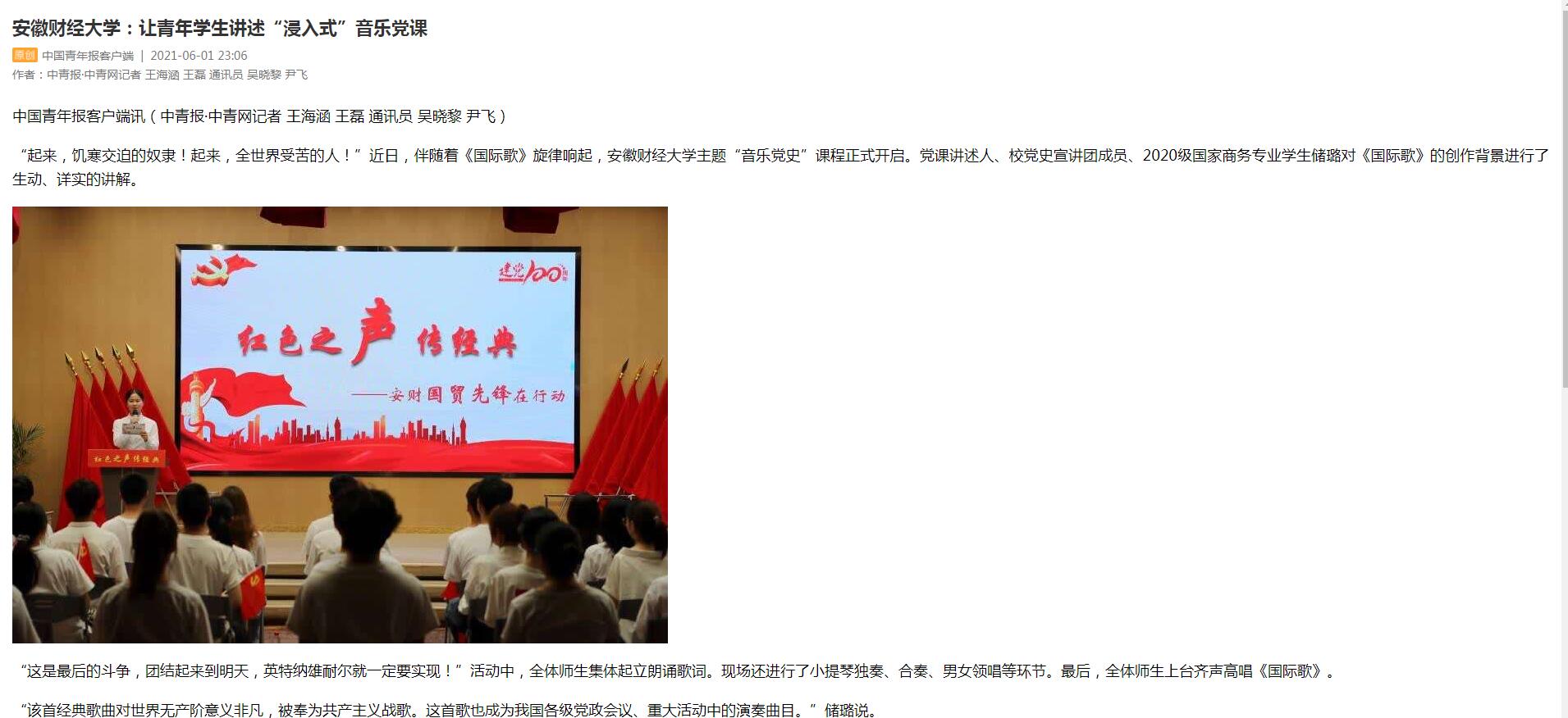 6月1日,中国青年报以《安徽财经大学:让青年学生讲述“浸入式”音乐党课》为题,报道我校开展音乐党史系列主题活动。