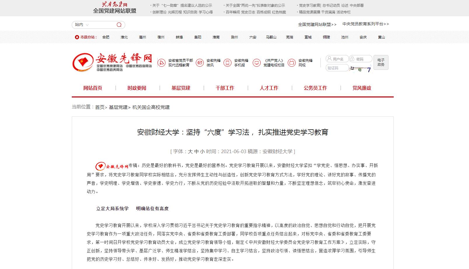 6月3日,安徽先锋网报道我校坚持“六度”学习法,扎实推荐党史学习教育。