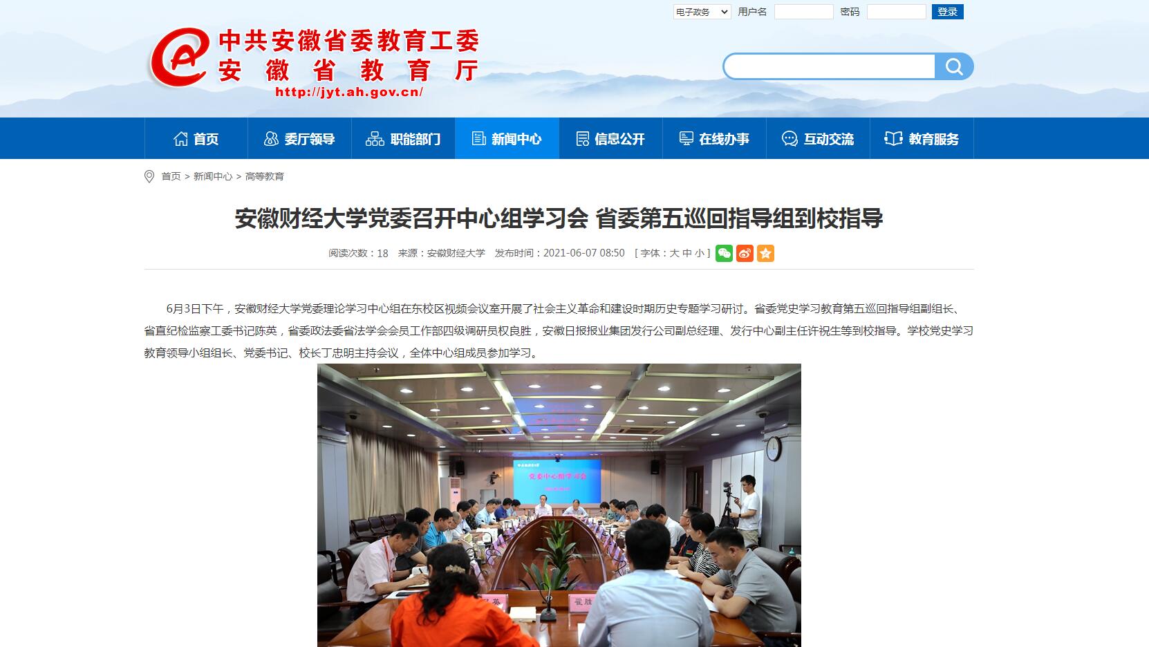 6月7日,安徽教育网以《安徽财经大学党委召开中心组学习会 省委第五巡回指导组到校指导》为题报道省委第五巡回指导组到我校指导党史学习教育。