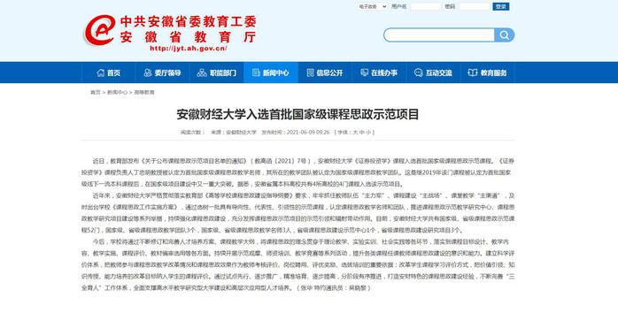 6月9月,安徽教育网报道我校《证券投资学》入选首批国家级课程思政示范项目。