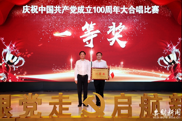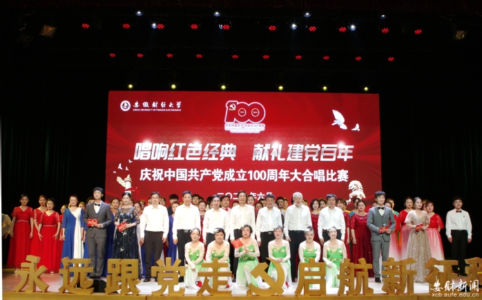 校党委书记、校长丁忠明在致辞中指出,“唱响红色经典 献礼建党百年”大合唱比赛是学校党委贯彻落实党中央决策部署、深入学习贯彻习近平总书记在党史学习教育动员大会上的重要讲话精神、上好“党史”“四史”思政大课重要举措之一。活动启动以来,安财校园随处可闻歌颂党、歌颂祖国的嘹亮歌声,充分表现出凝心聚力、同唱一首歌的良好精神风貌和时代风采。此次合唱比赛,广大师生在红色旋律中重温党的光辉历程,感悟党的初心使命,展现全体安财人热爱党、热爱祖国的豪迈与担当。丁忠明希望全体师生要唱响理想之声,用深情缅怀先烈,用信仰凝聚力量;唱响时代之声,共同唱出饱含记忆、催人奋进的红色音符,唱出砥砺前行、奋发有为的时代强音;唱响安财之声,共同唱出为党育人、为国育才的初心使命,唱出攻坚克难、迈向一流的安财力量;要从党史中不断汲取前进智慧,更加坚定自觉投身学校新时期高质量发展的改革实践,在新征程中开新局谋新篇,以优异成绩庆祝建党100周年。