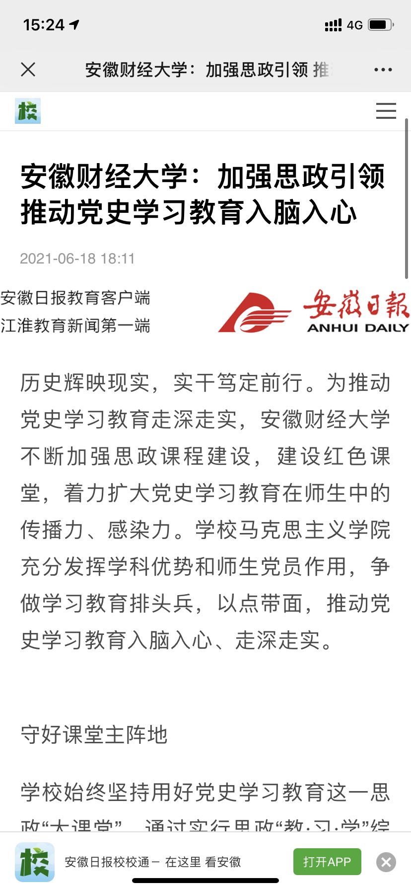 6月18日,安徽新闻网以《安徽财经大学:加强思政引领 推动党史学习教育入脑入心》为题,报道我校党史学习教育情况。