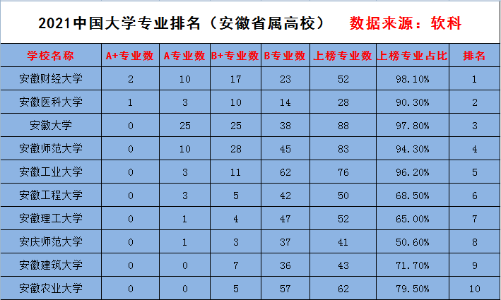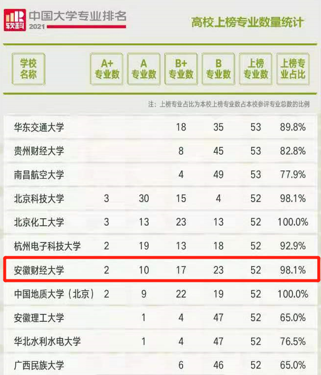 6月22日,2021“软科中国大学专业排名”正式发布,我校以2个A+专业、10个A专业、17个B+专业、23个B专业、上榜专业数52个、上榜专业占比98.1%的骄人成绩,位列全国财经类高校第十名、安徽省属高校第一名。