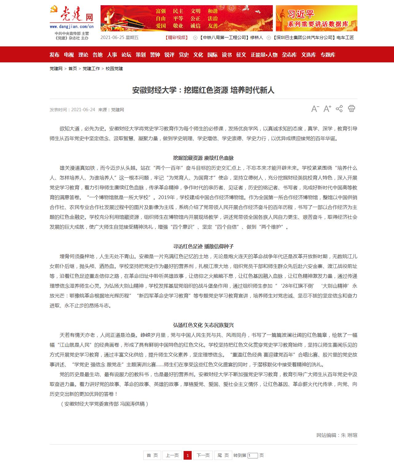6月24日,党建网以《安徽财经大学:挖掘红色资源 培养时代新人》报道我校党史学习教育开展情况。