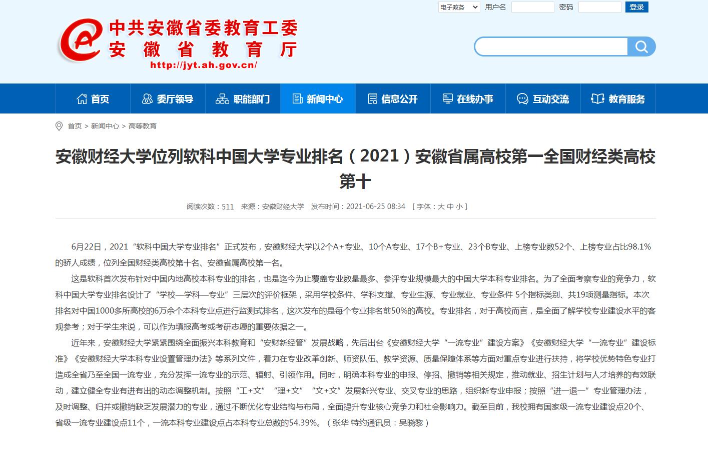 6月25日,安徽教育网以《安徽财经大学位列软科中国大学专业排名(2021)安徽省属高校第一全国财经类高校第十》为题报道我校专业建设取得的优异成绩。