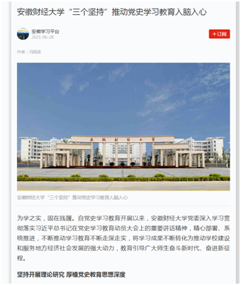 6月28日,学习强国以《安徽财经大学“三个坚持”推动党史学习教育入脑入心》报道我校多措并举推动党史学习教育。