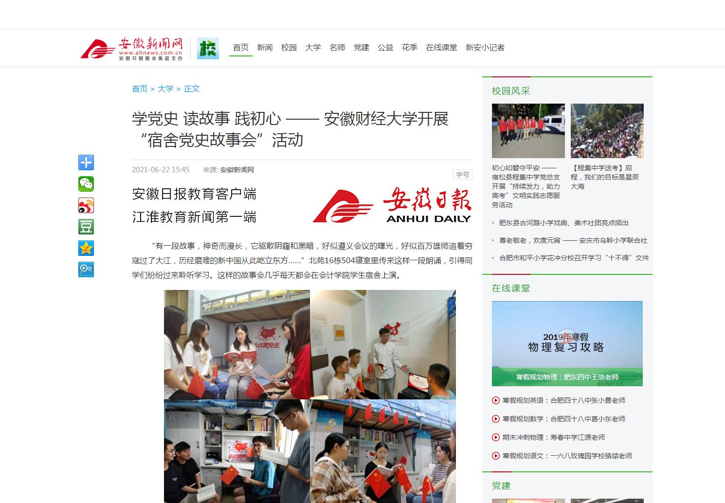6月22日,凤凰网、安徽新闻网以《学党史 读故事 践初心 —— 安徽财经大学开展“宿舍党史故事会”活动》报道我校开展特色党史学习教育。