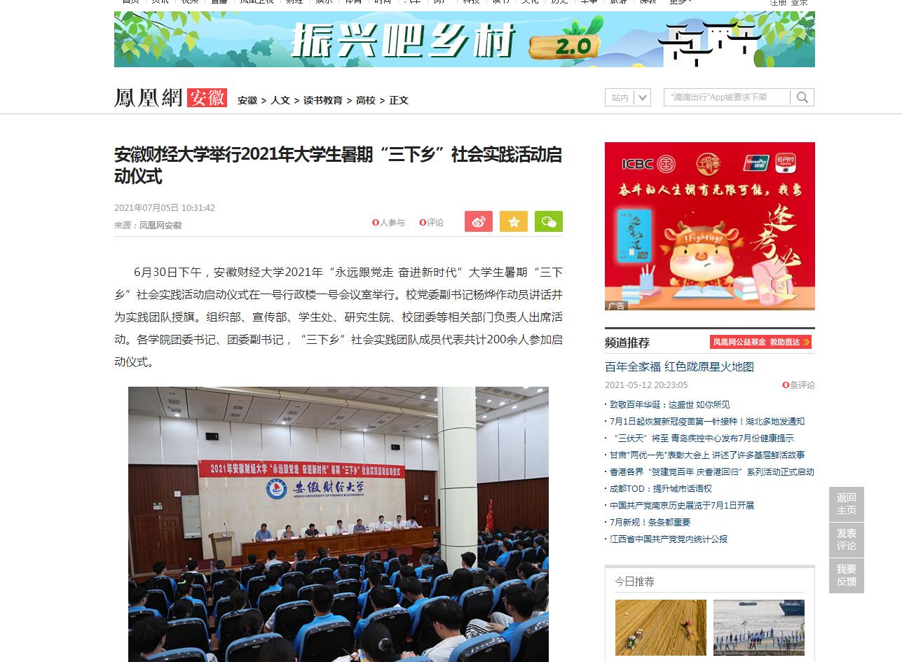 6月30日,凤凰网、安徽新闻网以《安徽财经大学举行2021年大学生暑期“三下乡”社会实践活动启动仪式》报道我校。