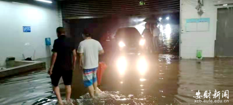 (校园保障中心工作人员对餐饮中心地下室积水进行抢排)