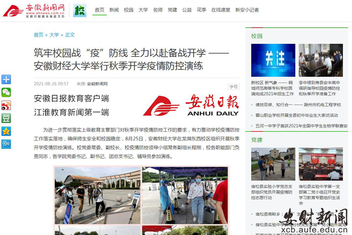 8月26日,安徽教育网、安徽新闻网、凤凰网报道我校举行秋季开学疫情防控演练。