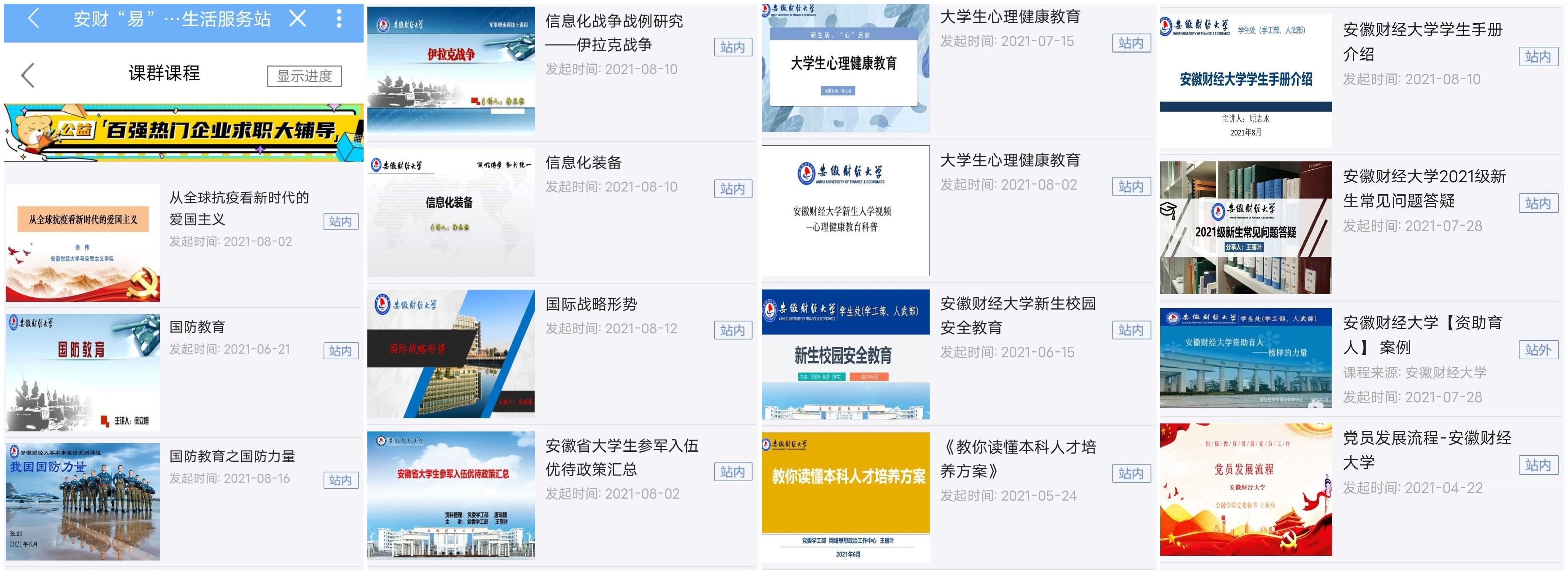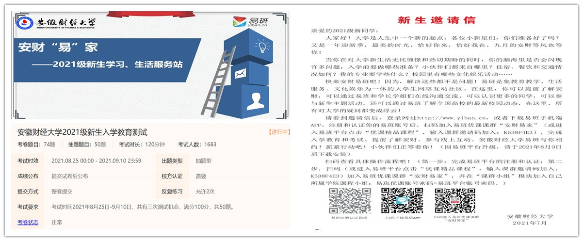 入学教育是新生入校后的第一堂课和关键一课,是学生成才发展的“指路明灯”,也是加强大学生思想政治教育的重要载体和手段。基于Z世代大学新生受数字信息技术、即时通信设备等影响比较大的特点,学校利用易班平台搭建“安财‘易’家——2021级新生学习、生活服务站”,通过“五教育 一引领”网络课程体系和线上互动服务平台,前置新生入学教育和服务,在提高新生入学教育针对性和实效性的同时,打通了2021级新生深入了解学校的渠道。