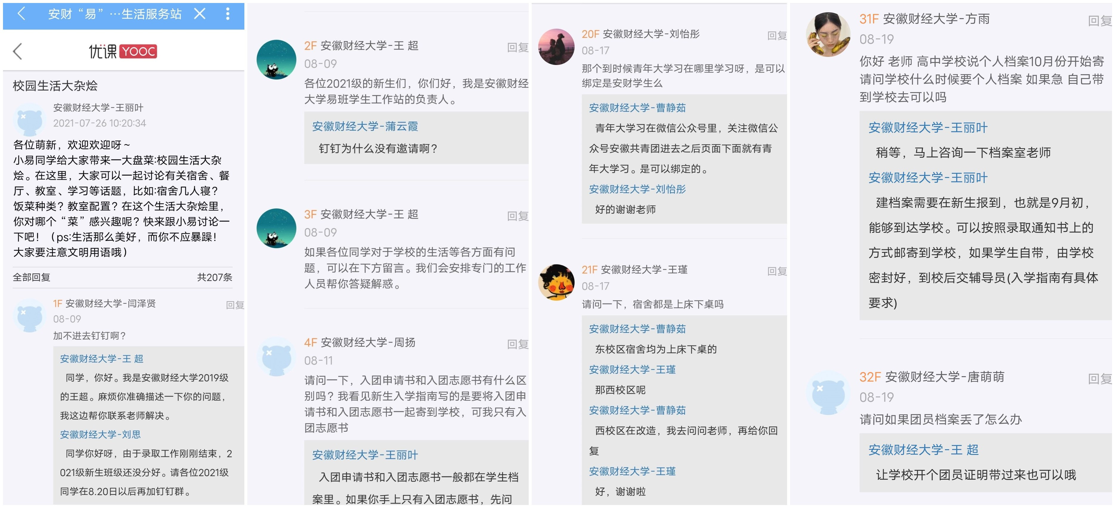 学校始终致力于用新技术新知识服务学生,不断出新招“解旧题”。新生对即将到来的大学生活充满了新奇和困惑,为了更好的在学习上引领新生,在生活上服务新生,面对新生官方答疑渠道空白的“旧题”,安财‘易’家——2021级新生学习、生活服务站”设置了服务新生的互动板块。“校园大杂烩” “萌新有话说”等课群话题,是专门为新生开设的线上互动板块。从学费缴纳到档案邮寄,从如何选课到生涯规划,从宿舍条件到校园设施,林林总总的问题,我校易班学生工作站第一时间为学生进行了精准解答。
