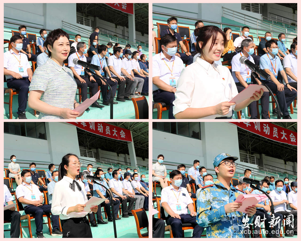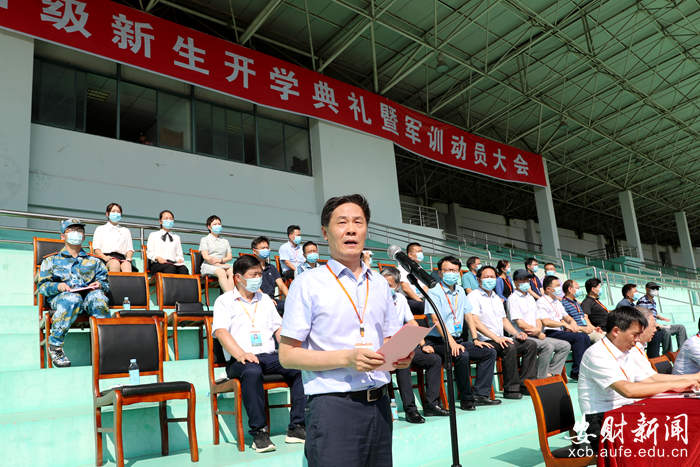校党委常委、宣传(统战)部部长李超宣读军训团任职命令。中国人民解放军某部军官丁凌达、军训教官钟凯、会计学院2021级会计3班杨鹏飞分别代表军训团军官、教官和新生发言。