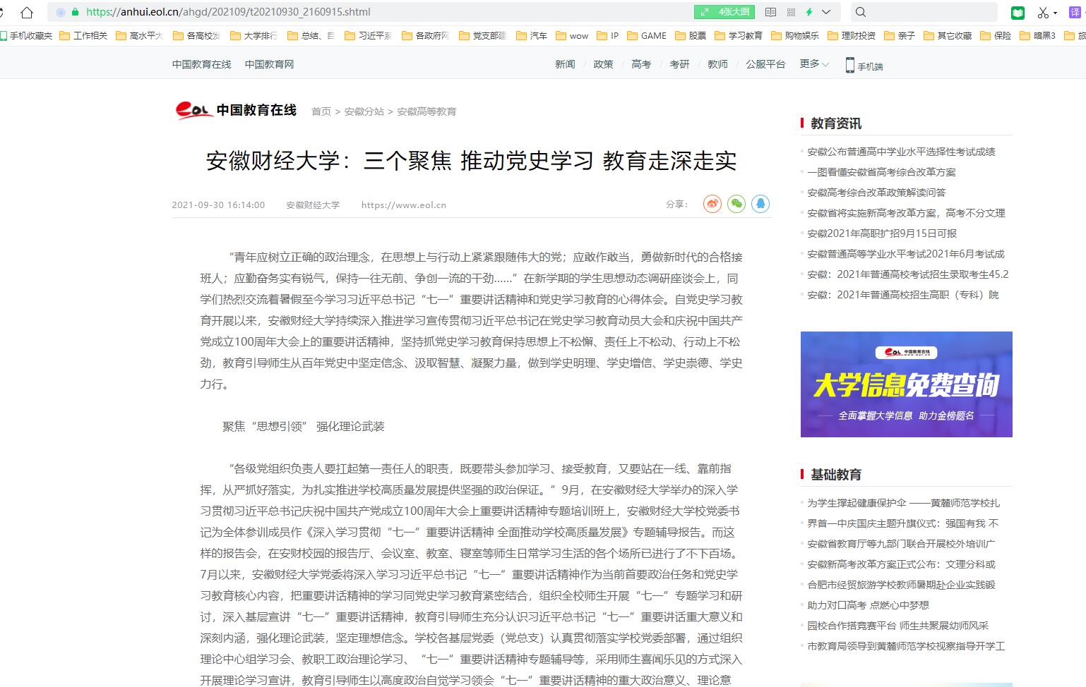 9月30日,中国教育在线以“安徽财经大学:三个聚焦 推动党史学习 教育走深走实”报道我校党史学习教育情况。