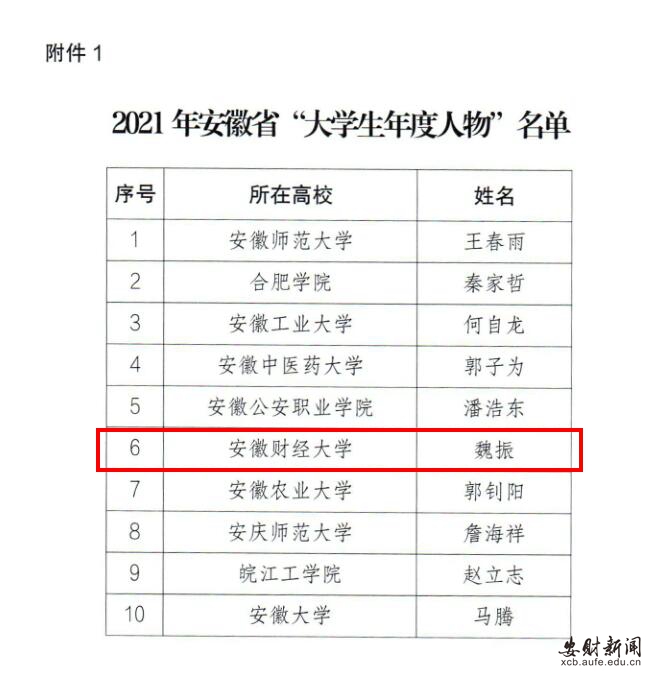 日前,中共安徽省委教育工委公布了2021年安徽省“大学生年度人物”和“大学生年度人物提名”评选结果名单,我校法学院2018级法学3班魏振获得“安徽省大学生年度人物”荣誉称号。