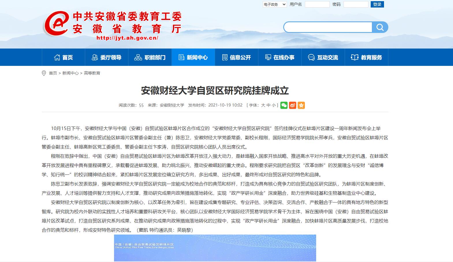 10月19日,安徽教育网、安徽新闻网报道我校自贸区研究院挂牌成立。