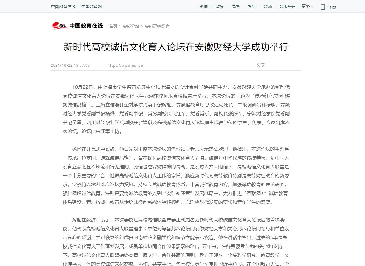 10月22日,中国教育在线报道我校成功举办新时代高校诚信文化育人论坛。