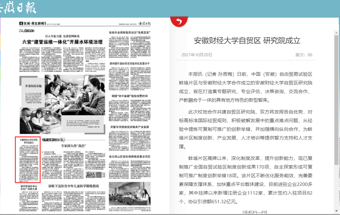 10月20日,《安徽日报》第6版以《安徽财经大学自贸区研究院成立》为题报道我校成立自贸区研究院,着力打造具体有地方特色的新型智库。