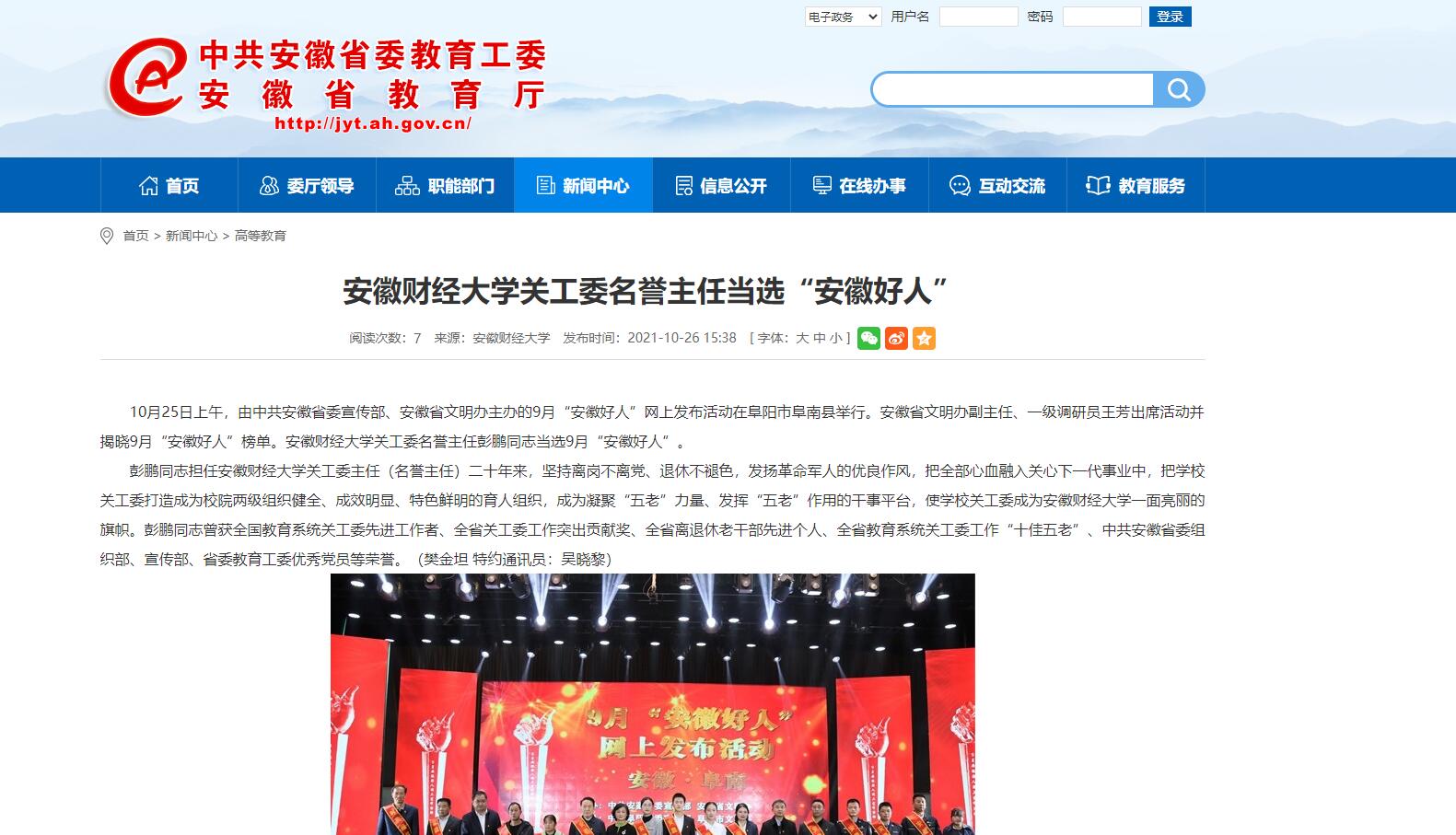 10月26日,安徽日报客户端、安徽教育网、安徽新闻网、凤凰网报道我校关工委名誉主任彭鹏当选“安徽好人”。