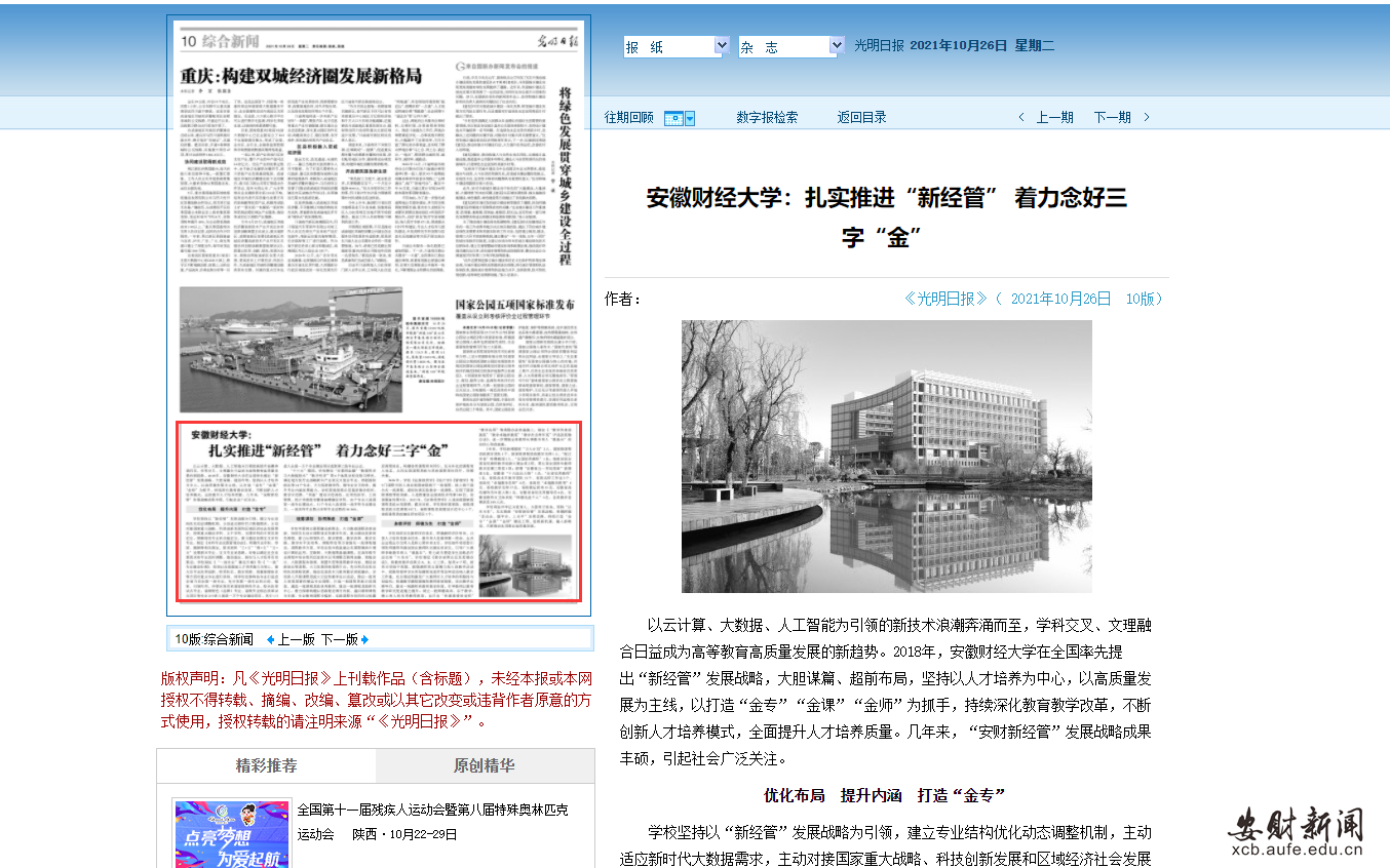 10月26日,《光明日报》以《安徽财经大学:扎实推进“新经管” 着力念好三字“金”》为题报道我校“新经管”建设成效。