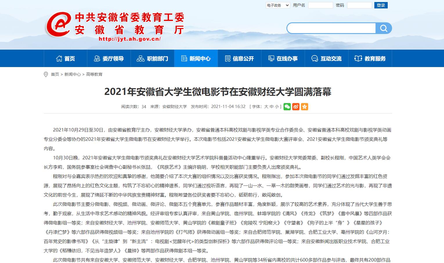 11月4日,安徽教育网报道2021年安徽省大学生微电影节在我校圆满落幕。