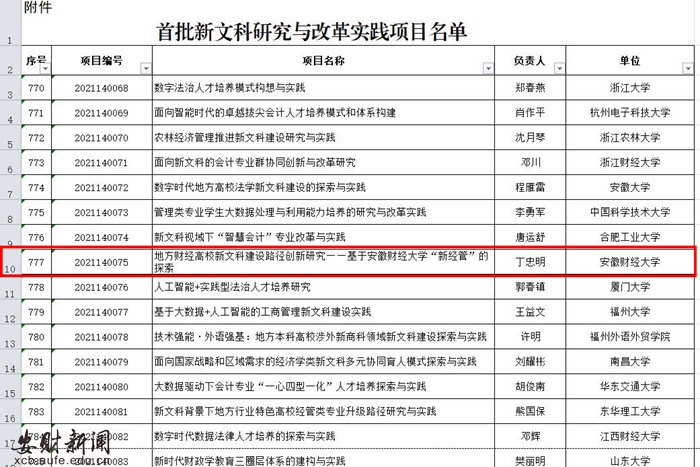 近日,教育部办公厅发布了《关于公布首批新文科研究与改革实践项目的通知》,由我校党委书记、校长丁忠明教授负责的《地方财经高校新文科建设路径创新研究—基于安徽财经大学“新经管”的探索》获立项。