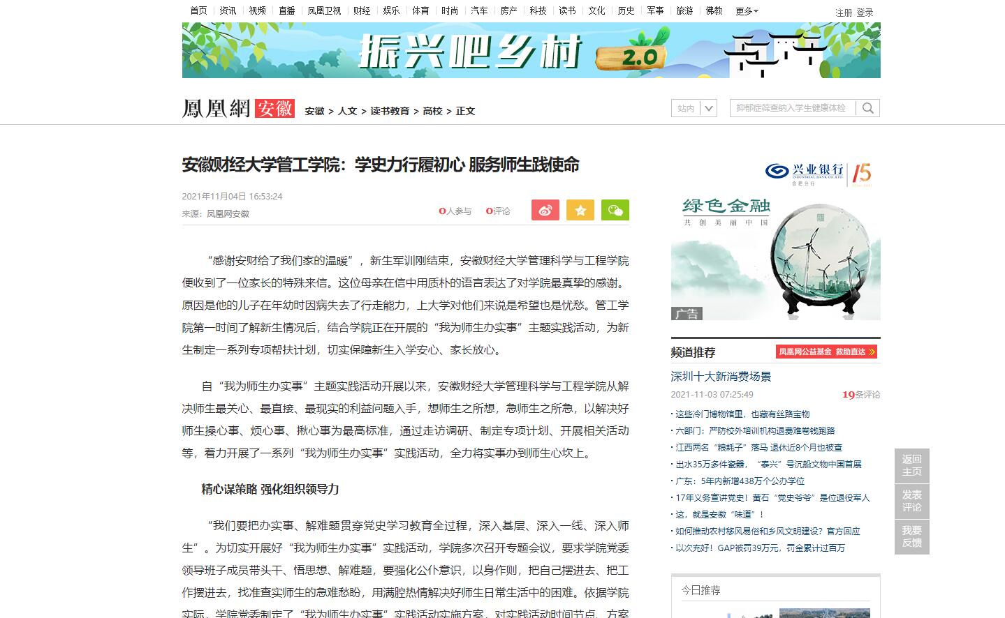 11月4日,凤凰网、安徽新闻网报道我校学史力行履初心,服务师生践使命。
